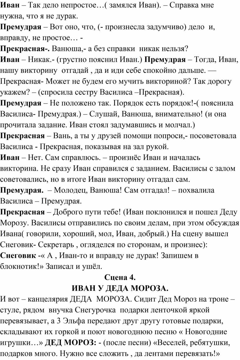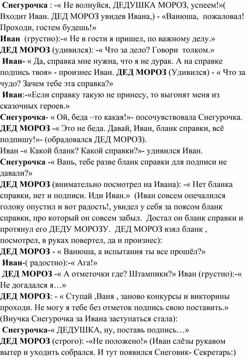 Иван- « Да, справка мне нужна, что я не дурак. А на справке подпись твоя» - произнес Иван. ДЕД МОРОЗ (Удивился) - « Что за чудо? Зачем тебе эта справка?»