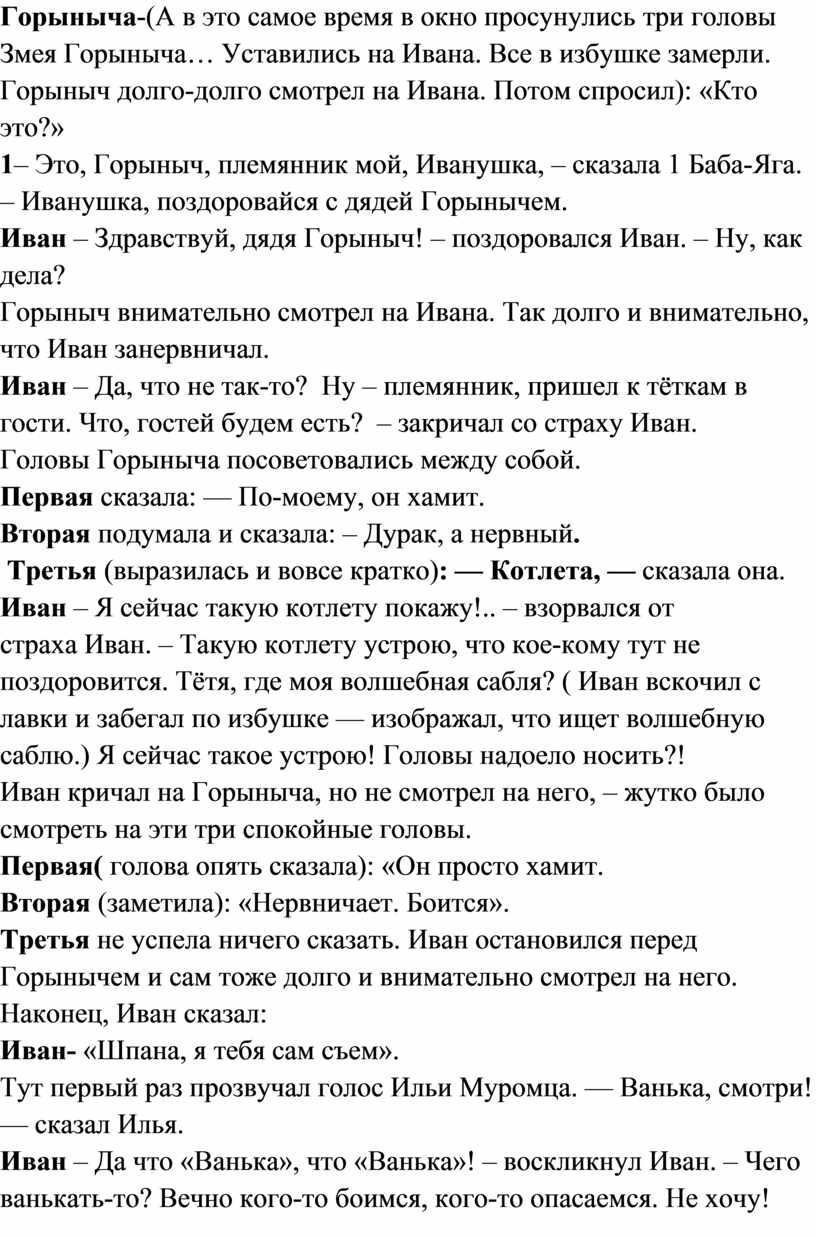 Горыныча-(А в это самое время в окно просунулись три головы Змея Горыныча… Уставились на Ивана. Все в избушке замерли. Горыныч долго-долго смотрел на Ивана. Потом спросил): «Кто это?»