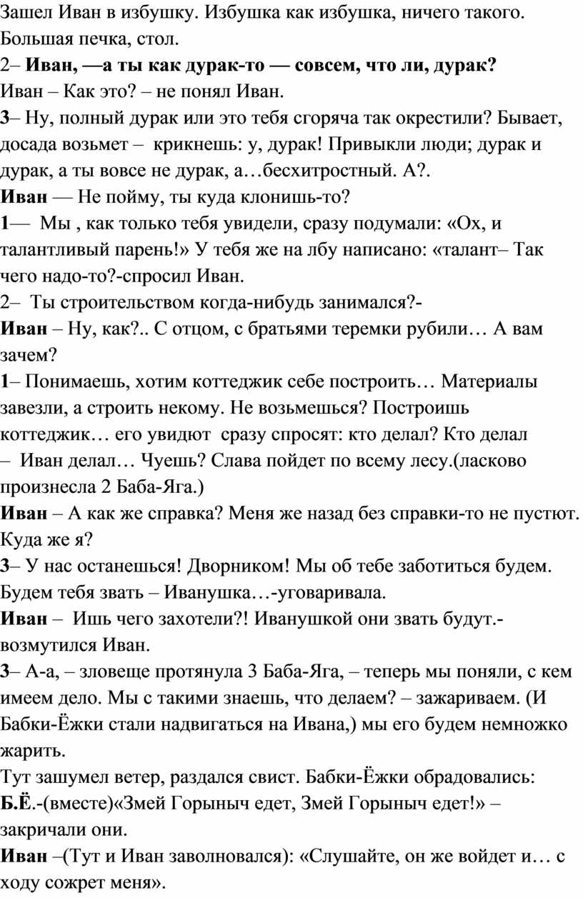 1– Понимаешь, хотим коттеджик себе построить… Материалы завезли, а строить некому. Не возьмешься? Построишь коттеджик… его увидют сразу спросят: кто делал? Кто делал – Иван делал… Чуешь? Слава пойдет по всему лесу.(ласково произнесла 2 Баба-Яга.)