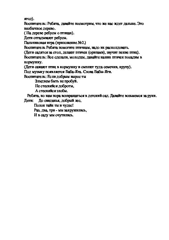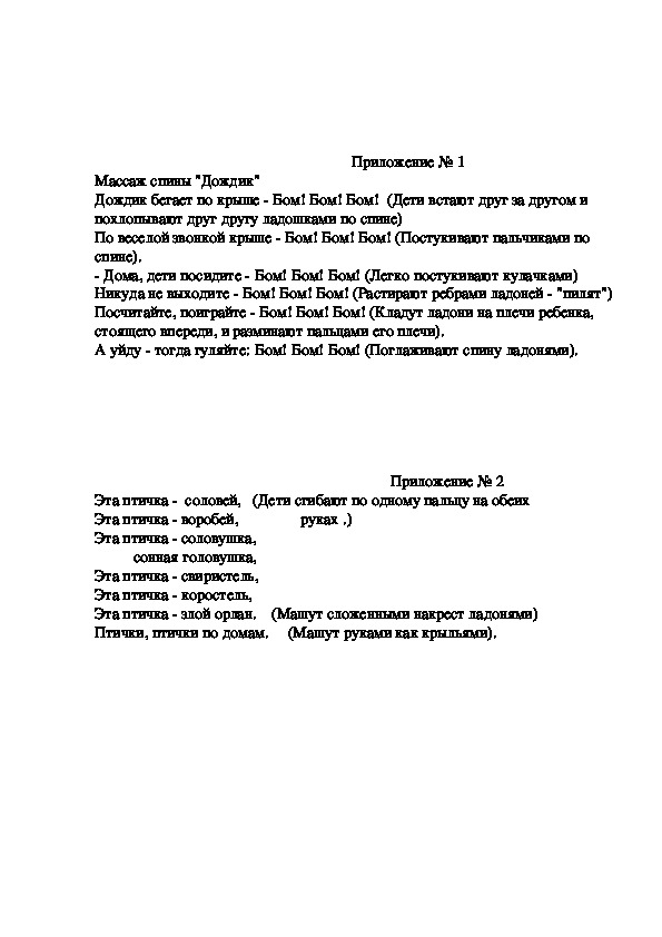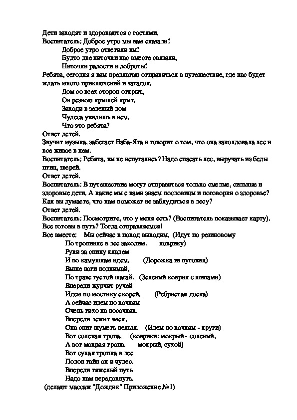 (делают массаж "Дождик" Приложение №1)Воспитатель: Ребята, предлагаю вам подышать свежим, лесным воздухом.