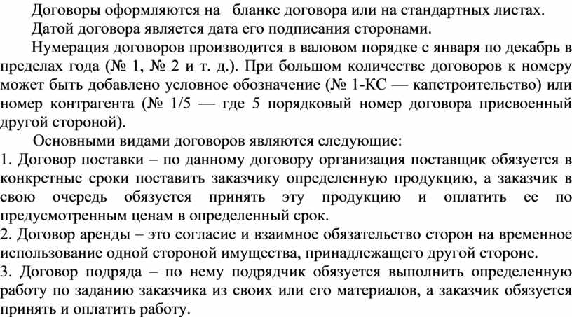 1. Договор поставки – по данному договору организация поставщик обязуется в конкретные сроки поставить заказчику определенную продукцию, а заказчик в свою очередь обязуется принять эту продукцию и оплатить ее по предусмотренным ценам в определенный срок.