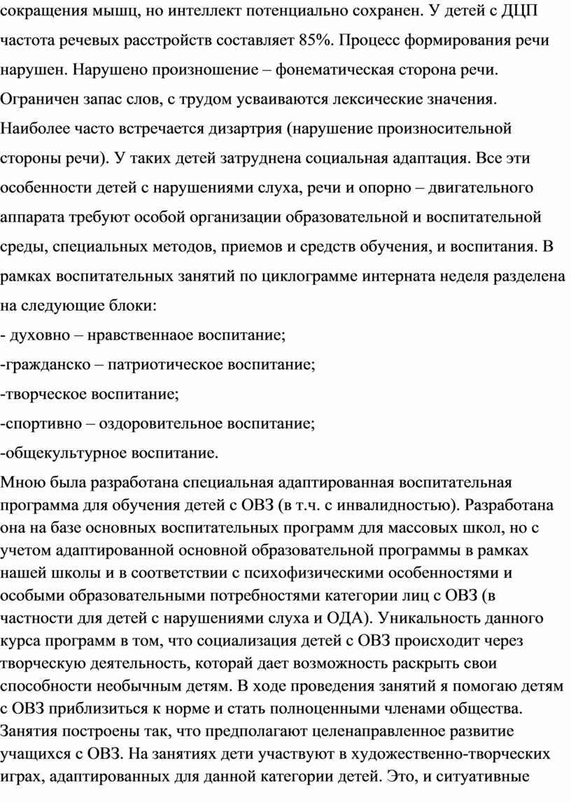4.Тот или иной вид нарушения познавательной деятельности зависит от формы заболевания. При поражении мышц нижних конечностей (одна из форм ДЦП) поражается головной мозг, наблюдаются расстройства речи, в некоторых случаях – легкая умственная отсталость, затруднена функция счета. При гетеркинетической форме ДЦП – наблюдаются непроизвольные сокращения мышц, но интеллект потенциально сохранен. У детей с ДЦП частота речевых расстройств составляет 85%. Процесс формирования речи нарушен. Нарушено произношение – фонематическая сторона речи. Ограничен запас слов, с трудом усваиваются лексические значения. Наиболее часто встречается дизартрия (нарушение произносительной стороны речи). У таких детей затруднена социальная адаптация. Все эти особенности детей с нарушениями слуха, речи и опорно – двигательного аппарата требуют особой организации образовательной и воспитательной среды, специальных методов, приемов и средств обучения, и воспитания. В рамках воспитательных занятий по циклограмме интерната неделя разделена на следующие блоки: