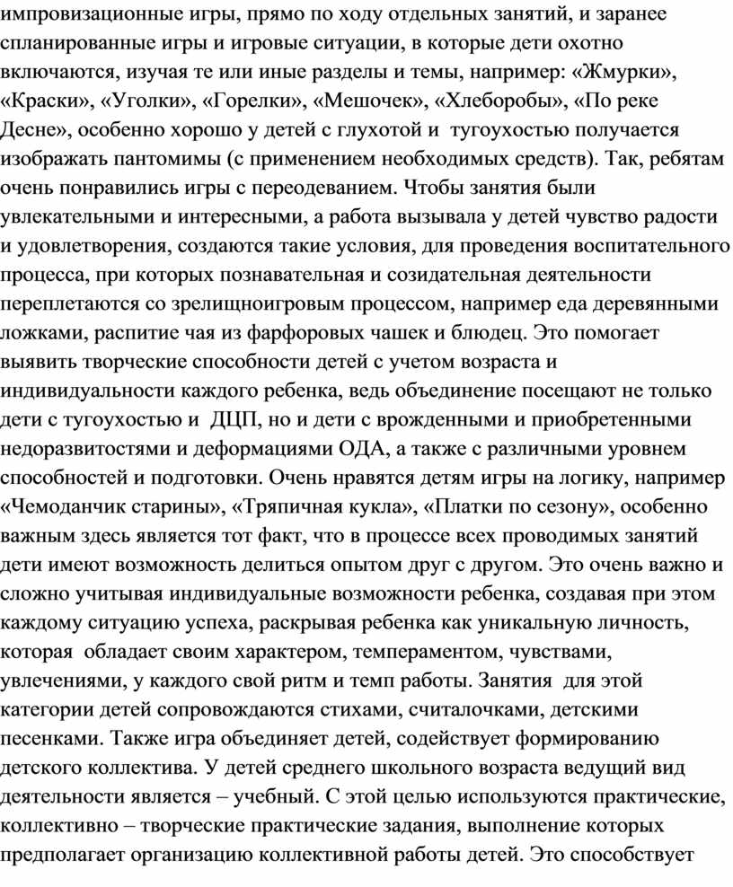 Мною была разработана специальная адаптированная воспитательная программа для обучения детей с ОВЗ (в т.ч. с инвалидностью). Разработана она на базе основных воспитательных программ для массовых школ, но с учетом адаптированной основной образовательной программы в рамках нашей школы и в соответствии с психофизическими особенностями и особыми образовательными потребностями категории лиц с ОВЗ (в частности для детей с нарушениями слуха и ОДА). Уникальность данного курса программ в том, что социализация детей с ОВЗ происходит через творческую деятельность, которай дает возможность раскрыть свои способности необычным детям. В ходе проведения занятий я помогаю детям с ОВЗ приблизиться к норме и стать полноценными членами общества. Занятия построены так, что предполагают целенаправленное развитие учащихся с ОВЗ. На занятиях дети участвуют в художественно-творческих играх, адаптированных для данной категории детей. Это, и ситуативные импровизационные игры, прямо по ходу отдельных занятий, и заранее спланированные игры и игровые ситуации, в которые дети охотно включаются, изучая те или иные разделы и темы, например: «Жмурки», «Краски», «Уголки», «Горелки», «Мешочек», «Хлеборобы», «По реке Десне», особенно хорошо у детей с глухотой и тугоухостью получается изображать пантомимы (с применением необходимых средств). Так, ребятам очень понравились игры с переодеванием. Чтобы занятия были увлекательными и интересными, а работа вызывала у детей чувство радости и удовлетворения, создаются такие условия, для проведения воспитательного процесса, при которых познавательная и созидательная деятельности переплетаются со зрелищноигровым процессом, например еда деревянными ложками, распитие чая из фарфоровых чашек и блюдец. Это помогает выявить творческие способности детей с учетом возраста и индивидуальности каждого ребенка, ведь объединение посещают не только дети с тугоухостью и ДЦП, но и дети с врожденными и приобретенными недоразвитостями и деформациями ОДА, а также с различными уровнем способностей и подготовки. Очень нравятся детям игры на логику, например «Чемоданчик старины», «Тряпичная кукла», «Платки по сезону», особенно важным здесь является тот факт, что в процессе всех проводимых занятий дети имеют возможность делиться опытом друг с другом. Это очень важно и сложно учитывая индивидуальные возможности ребенка, создавая при этом каждому ситуацию успеха, раскрывая ребенка как уникальную личность, которая обладает своим характером, темпераментом, чувствами, увлечениями, у каждого свой ритм и темп работы. Занятия для этой категории детей сопровождаются стихами, считалочками, детскими песенками. Также игра объединяет детей, содействует формированию детского коллектива. У детей среднего школьного возраста ведущий вид деятельности является – учебный. С этой целью используются практические, коллективно – творческие практические задания, выполнение которых предполагает организацию коллективной работы детей. Это способствует объединению детей, содействует формированию детского коллектива. Коллективные задания широко используются среди детей с нарушением слуха, т.к. чувства коллектива, товарищества у них сильно развито. Так, на занятиях по патриотическому воспитанию дети изготавливали новогодние сувениры из с