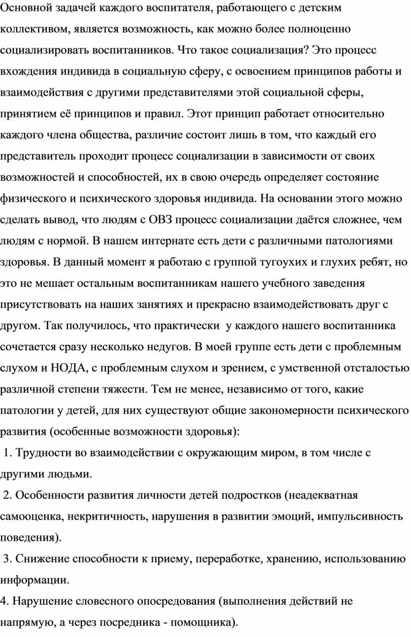 Основной задачей каждого воспитателя, работающего с детским коллективом, является возможность, как можно более полноценно социализировать воспитанников. Что такое социализация? Это процесс вхождения индивида в социальную сферу, с освоением принципов работы и взаимодействия с другими представителями этой социальной сферы, принятием её принципов и правил. Этот принцип работает относительно каждого члена общества, различие состоит лишь в том, что каждый его представитель проходит процесс социализации в зависимости от своих возможностей и способностей, их в свою очередь определяет состояние физического и психического здоровья индивида. На основании этого можно сделать вывод, что людям с ОВЗ процесс социализации даётся сложнее, чем людям с нормой. В нашем интернате есть дети с различными патологиями здоровья. В данный момент я работаю с группой тугоухих и глухих ребят, но это не мешает остальным воспитанникам нашего учебного заведения присутствовать на наших занятиях и прекрасно взаимодействовать друг с другом. Так получилось, что практически у каждого нашего воспитанника сочетается сразу несколько недугов. В моей группе есть дети с проблемным слухом и НОДА, с проблемным слухом и зрением, с умственной отсталостью различной степени тяжести. Тем не менее, независимо от того, какие патологии у детей, для них существуют общие закономерности психического развития (особенные возможности здоровья):