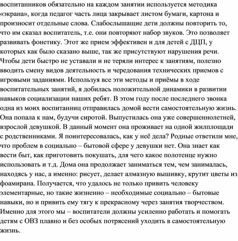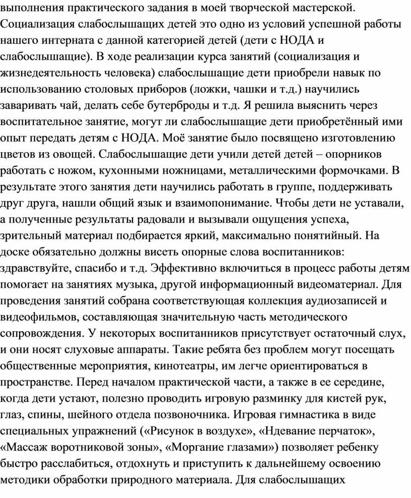 Такого рода занятия позволяют поддерживать у ребенка высокий уровень мотивации к изучению нового, усиливает гуманистическую направленность занятий с детьми данной категории. Любое моё занятие на любую тему заканчивается творческим заданием. Это благоприятно развивает познавательный интерес воспитанников и обеспечивает появления творческого настроения. Практическая деятельность обучающихся строится от простого к сложному, от учебных практических упражнений до выполнения практического задания в моей творческой мастерской. Социализация слабослышащих детей это одно из условий успешной работы нашего интерната с данной категорией детей (дети с НОДА и слабослышащие). В ходе реализации курса занятий (социализация и жизнедеятельность человека) слабослышащие дети приобрели навык по использованию столовых приборов (ложки, чашки и т.д.) научились заваривать чай, делать себе бутерброды и т.д. Я решила выяснить через воспитательное занятие, могут ли слабослышащие дети приобретённый ими опыт передать детям с НОДА. Моё занятие было посвящено изготовлению цветов из овощей. Слабослышащие дети учили детей детей – опорников работать с ножом, кухонными ножницами, металлическими формочками. В результате этого занятия дети научились работать в группе, поддерживать друг друга, нашли общий язык и взаимопонимание. Чтобы дети не уставали, а полученные результаты радовали и вызывали ощущения успеха, зрительный материал подбирается яркий, максимально понятийный. На доске обязательно должны висеть опорные слова воспитанников: здравствуйте, спасибо и т.д. Эффективно включиться в процесс работы детям помогает на занятиях музыка, другой информационный видеоматериал. Для проведения занятий собрана соответствующая коллекция аудиозаписей и видеофильмов, составляющая значительную часть методического сопровождения. У некоторых воспитанников присутствует остаточный слух, и они носят слуховые аппараты. Такие ребята без проблем могут посещать общественные мероприятия, кинотеатры, им легче ориентироваться в пространстве. Перед началом практической части, а также в ее середине, когда дети устают, полезно проводить игровую разминку для кистей рук, глаз, спины, шейного отдела позвоночника. Игровая гимнастика в виде специальных упражнений («Рисунок в воздухе», «Ндевание перчаток», «Массаж воротниковой зоны», «Моргание глазами») позволяет ребенку быстро расслабиться, отдохнуть и приступить к дальнейшему освоению методики обработки природного материала. Для слабослышащих воспитанников обязательно на каждом занятии используется методика «экрана», когда педагог часть лица закрывает листом бумаги, картона и произносит отдельные слова. Слабослышащие дети должны повторить то, что им сказал воспитатель, т.е. они повторяют набор звуков. Это позволяет развивать фонетику. Этот же прием эффективен и для детей с ДЦП, у которых как было сказано выше, так же присутствуют нарушения речи. Чтобы дети быстро не уставали и не теряли интерес к занятиям, полезно вводить смену видов деятельность и чередования технических приемов с игровыми заданиями. Используя все эти методы и приёмы в ходе воспитательных занятий, я добилась положительной динамики в развитии навыков социализации наших ребят. В этом году после последнего звонка одна из моих воспитанниц о