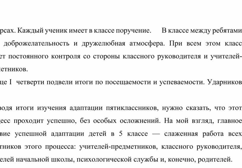 Подводя итоги изучения адаптации пятиклассников, нужно сказать, что этот процесс проходит успешно, без особых осложнений. На мой взгляд, главное условие успешной адаптации детей в 5 классе — слаженная работа всех участников этого процесса: учителей-предметников, классного руководителя, учителей начальной школы, психологической службы и, конечно, родителей.