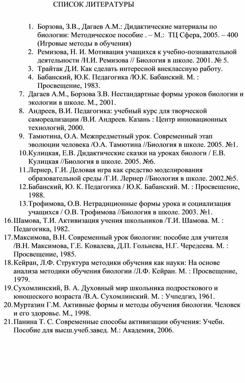 7. Дагаев А.М., Борзова З.В. Нестандартные формы уроков биологии и экологии в школе. М., 2001.