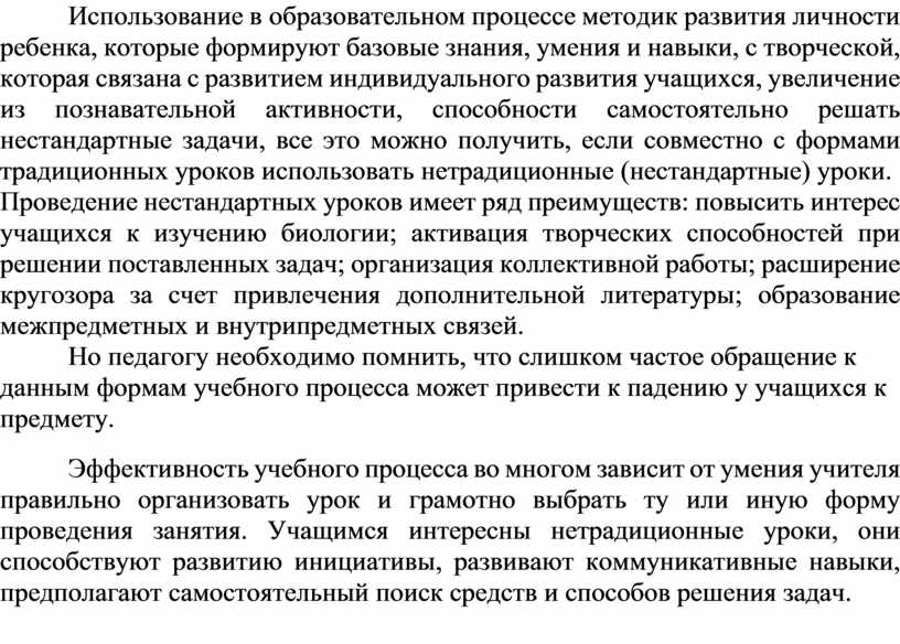 Использование в образовательном процессе методик развития личности ребенка, которые формируют базовые знания, умения и навыки, с творческой, которая связана с развитием индивидуального развития учащихся, увеличение из познавательной активности, способности самостоятельно решать нестандартные задачи, все это можно получить, если совместно с формами традиционных уроков использовать нетрадиционные (нестандартные) уроки.