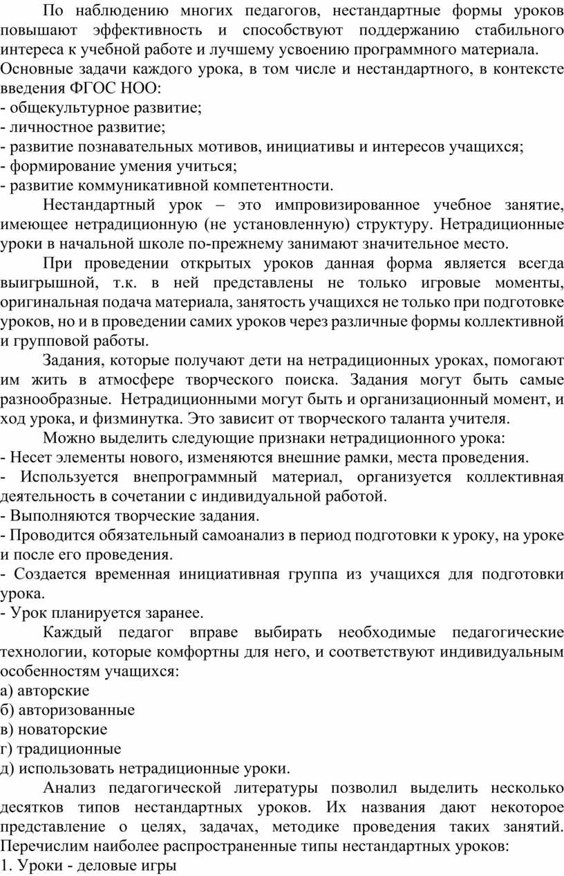 Нестандартный урок – это импровизированное учебное занятие, имеющее нетрадиционную (не установленную) структуру. Нетрадиционные уроки в начальной школе по-прежнему занимают значительное место.