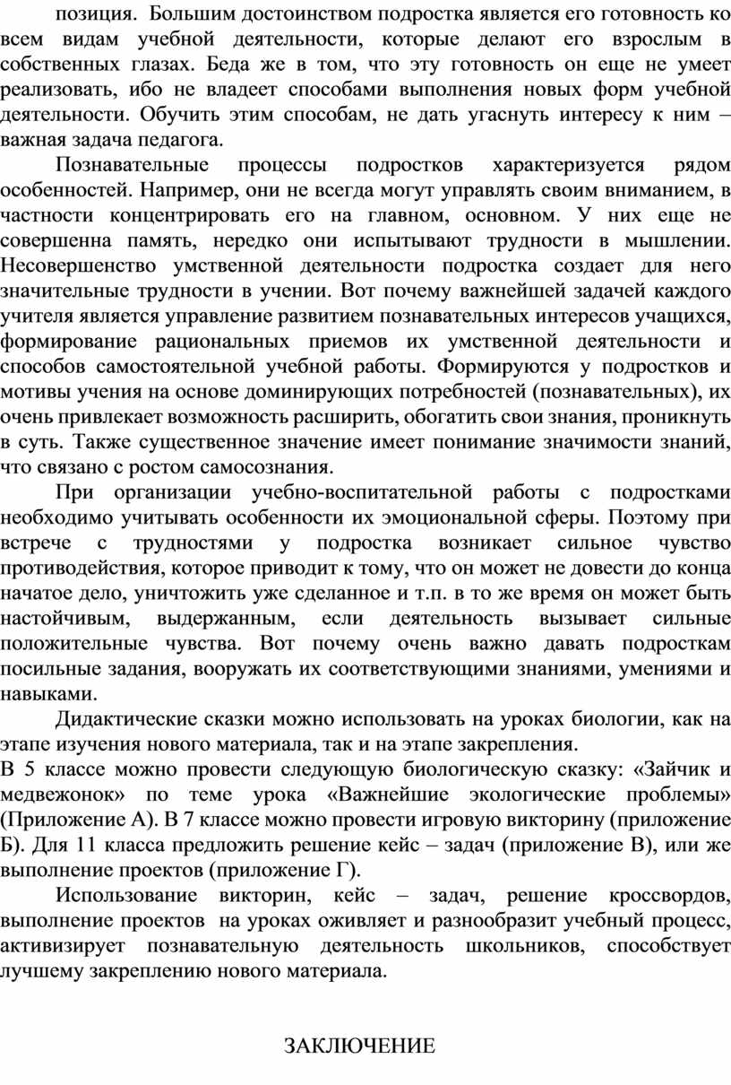 Подростковый возраст является наиболее трудным при организации учебно–воспитательной работ, но данный этап играет важную роль в психическом развитии и формировании личности. В данный период усиленно воспринимаются социальные ценности, формируется жизненная позиция. Большим достоинством подростка является его готовность ко всем видам учебной деятельности, которые делают его взрослым в собственных глазах. Беда же в том, что эту готовность он еще не умеет реализовать, ибо не владеет способами выполнения новых форм учебной деятельности. Обучить этим способам, не дать угаснуть интересу к ним – важная задача педагога.