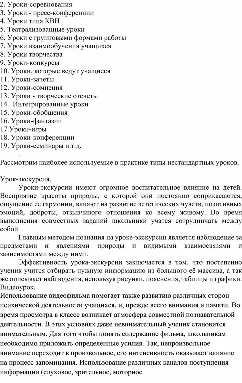 Какие же нетрадиционные формы проведения уроков известны в настоящее время? Это уроки-семинары, зачеты, лекции, конкурсы, уроки-экскурсии, интегрированные уроки, занятия-конференции, диспуты, тематические игровые уроки, благодаря которым ученики быстрее и лучше усваивают программный материал.