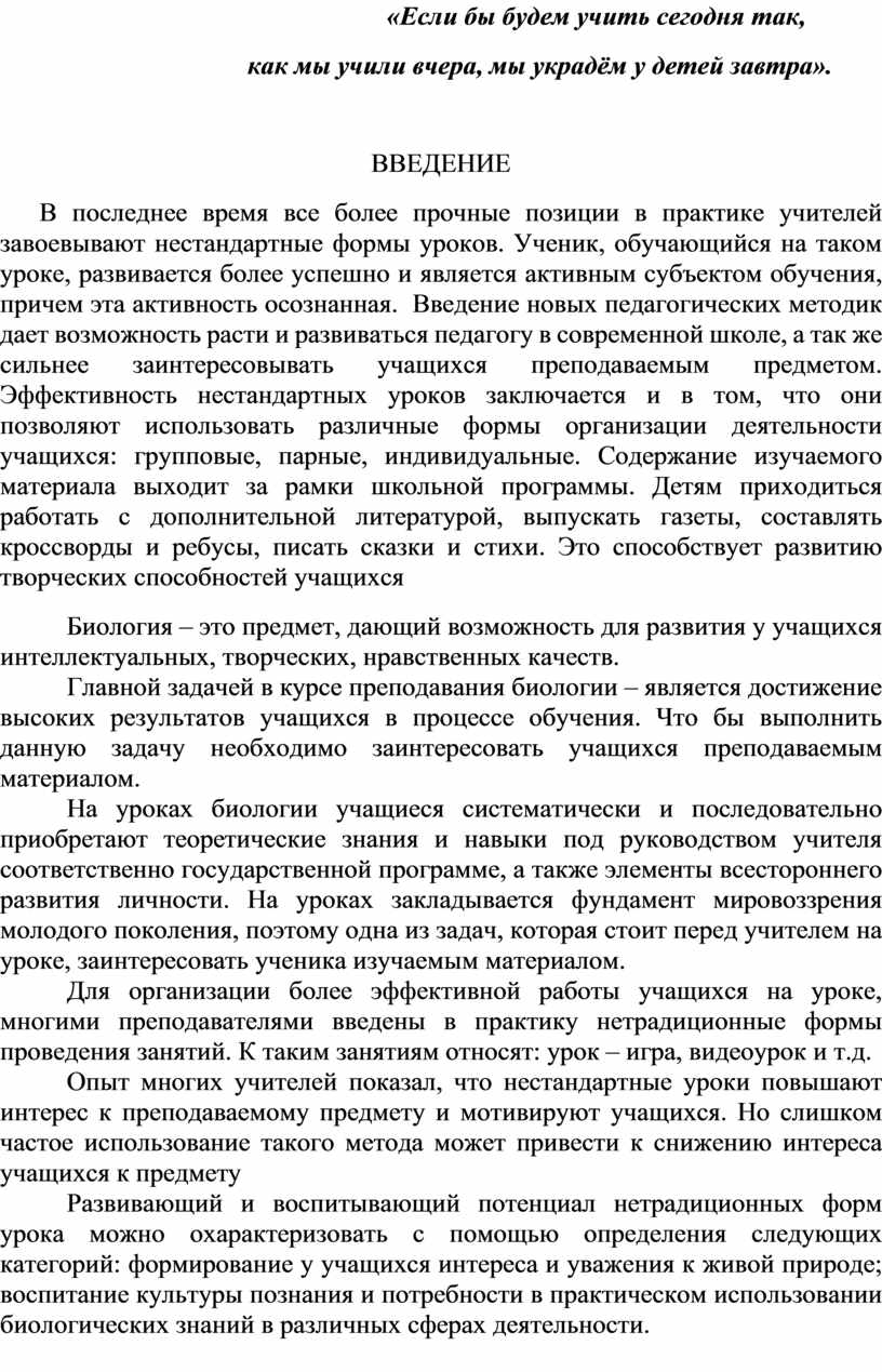 На современном этапе обучения биологии применяются нестандартные уроки. Нестандартные уроки биологии приобретают различные внешние формы в зависимости от содержания, оформления и некоторых других причин. Это связано с усилением акцента на формирование познавательного интереса школьников к учебным предметам. Нестандартные уроки – уроки, которые имеют необычную методическую структуру, выходящую за рамки стандарта. Это урок нестандартный, обязательно заключающий в себе что-то творческое, требующий напряжение эмоциональных и умственных сил. Нестандартные уроки отличаются активностью учащихся, сочетанием фронтальных, групповых и индивидуальных способов организации обучения, связью педагогического руководства и самостоятельности обучающихся, развитием коммуникативных способностей, атмосферой сотрудничества на занятиях. Эти формы создают наилучшие условия для передачи учащимся знаний, умений и навыков.