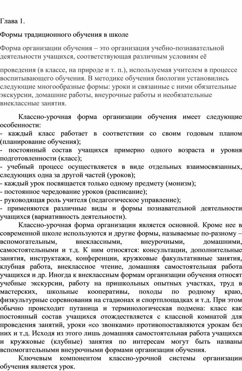 проведения (в классе, на природе и т. п.), используемая учителем в процессе воспитывающего обучения. В методике обучения биологии установились следующие многообразные формы: уроки и связанные с ними обязательные экскурсии, домашние работы, внеурочные работы и необязательные внеклассные занятия.