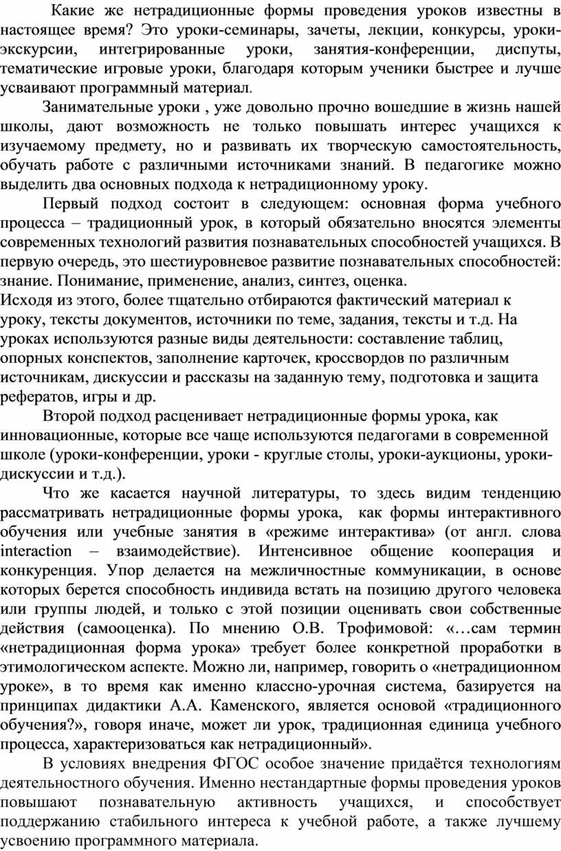 Что же касается научной литературы, то здесь видим тенденцию рассматривать нетрадиционные формы урока, как формы интерактивного обучения или учебные занятия в «режиме интерактива» (от англ. слова interaction – взаимодействие). Интенсивное общение кооперация и конкуренция. Упор делается на межличностные коммуникации, в основе которых берется способность индивида встать на позицию другого человека или группы людей, и только с этой позиции оценивать свои собственные действия (самооценка). По мнению О.В. Трофимовой: «…сам термин «нетрадиционная форма урока» требует более конкретной проработки в этимологическом аспекте. Можно ли, например, говорить о «нетрадиционном уроке», в то время как именно классно-урочная система, базируется на принципах дидактики А.А. Каменского, является основой «традиционного обучения?», говоря иначе, может ли урок, традиционная единица учебного процесса, характеризоваться как нетрадиционный».