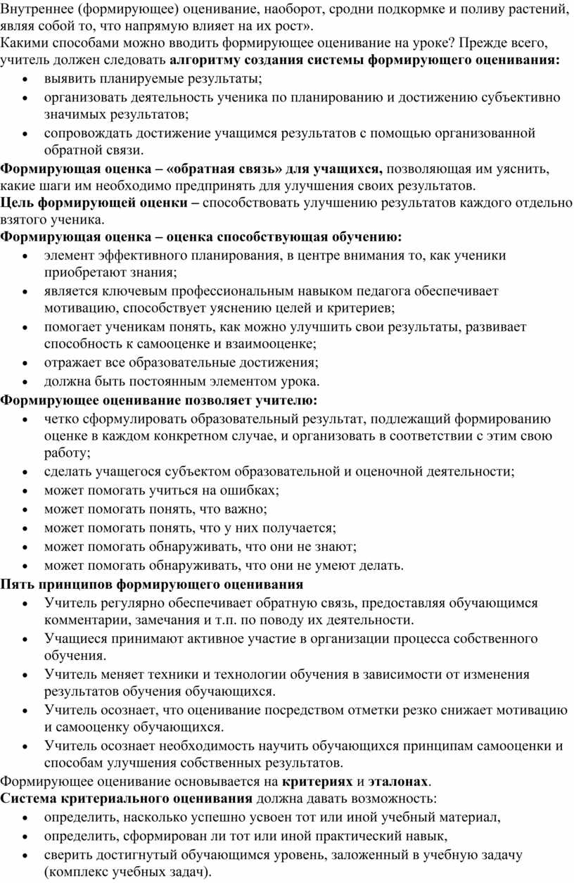 Описать суть формирующего (внутреннего) оценивания можно следующей метафорой: «Если представить учеников в образе растений, то внешнее (суммирующее) оценивание растений есть процесс простого измерения их роста. Результаты измерений могут быть интересны для сравнения и анализа, но сами по себе они не влияют на рост растений. Внутреннее (формирующее) оценивание, наоборот, сродни подкормке и поливу растений, являя собой то, что напрямую влияет на их рост».