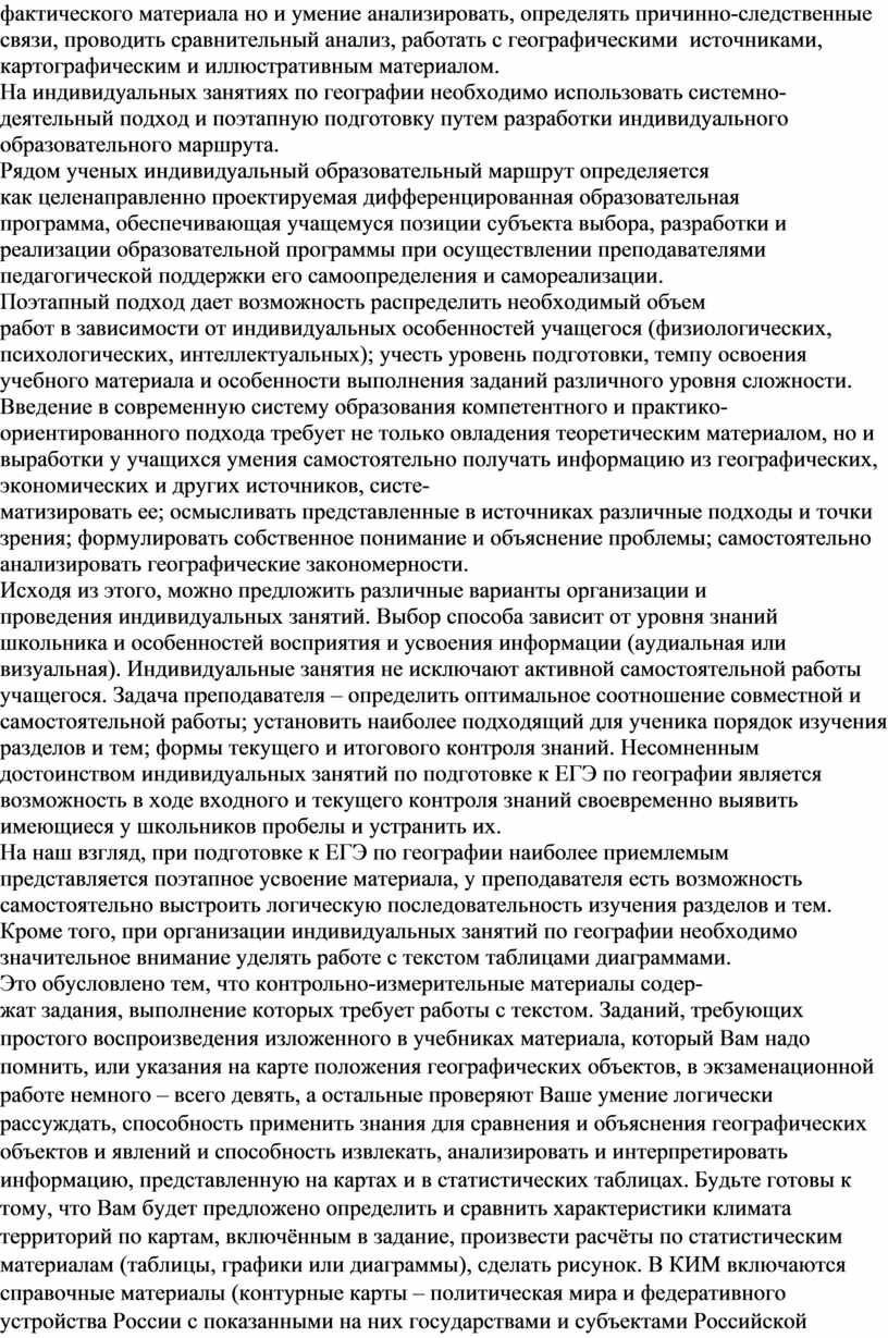 представляется поэтапное усвоение материала, у преподавателя есть возможность самостоятельно выстроить логическую последовательность изучения разделов и тем. Кроме того, при организации индивидуальных занятий по географии необходимо значительное внимание уделять работе с текстом таблицами диаграммами.