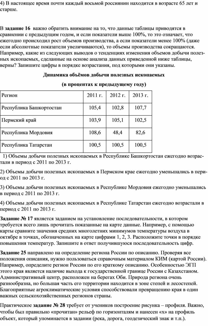 Задания 8-10 учитывают закономерности, что от экономического уровня развития страны зависит доля детей, старших, типы воспроизводства, уровень урбанизации, занятость населения, направления миграций и их качественный состав и т.п. К тому же, учащиеся должны знать мегаполисы и крупнейшие агломерации мира, города-миллионеры России, закономерности размещения населения и т.п. Например, задание № 8: в какой из перечисленных стран доля детей в общей численности населения наибольшая?