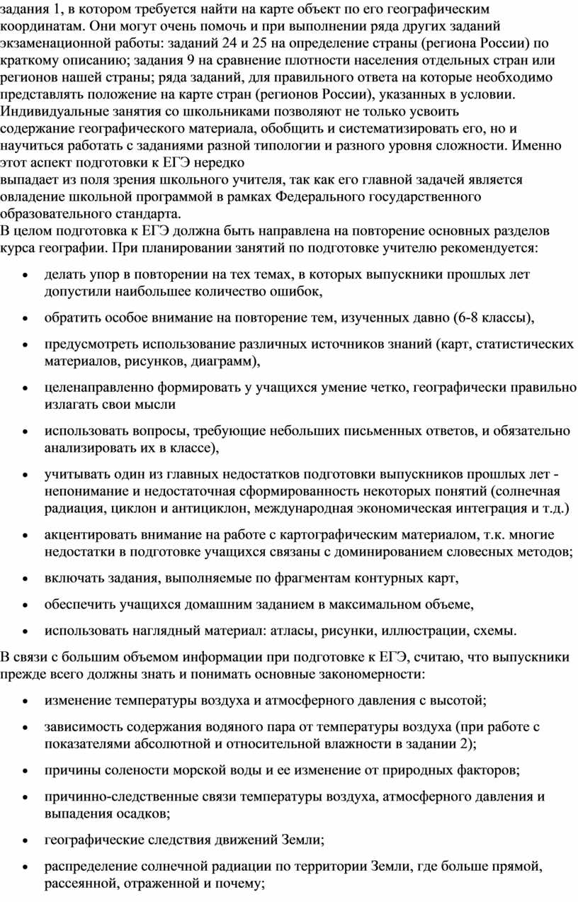 В целом подготовка к ЕГЭ должна быть направлена на повторение основных разделов курса географии. При планировании занятий по подготовке учителю рекомендуется: