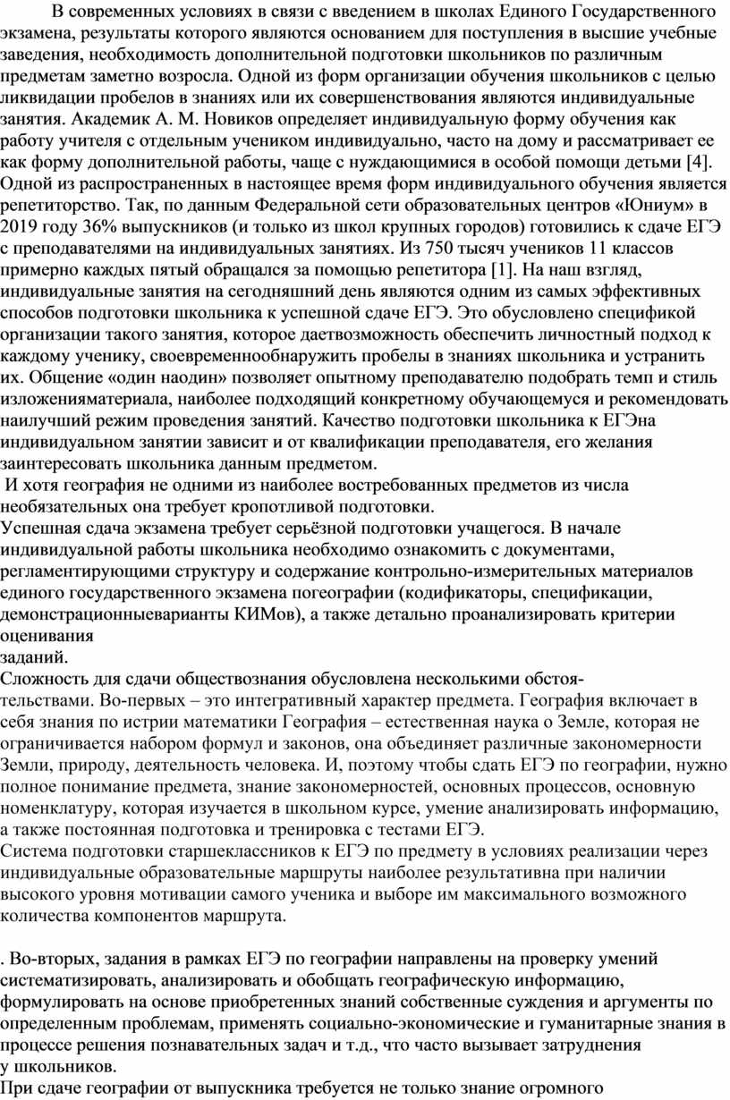 проведения индивидуальных занятий. Выбор способа зависит от уровня знаний школьника и особенностей восприятия и усвоения информации (аудиальная или визуальная). Индивидуальные занятия не исключают активной самостоятельной работы учащегося. Задача преподавателя – определить оптимальное соотношение совместной и самостоятельной работы; установить наиболее подходящий для ученика порядок изучения разделов и тем; формы текущего и итогового контроля знаний. Несомненным достоинством индивидуальных занятий по подготовке к ЕГЭ по географии является возможность в ходе входного и текущего контроля знаний своевременно выявить имеющиеся у школьников пробелы и устранить их.
