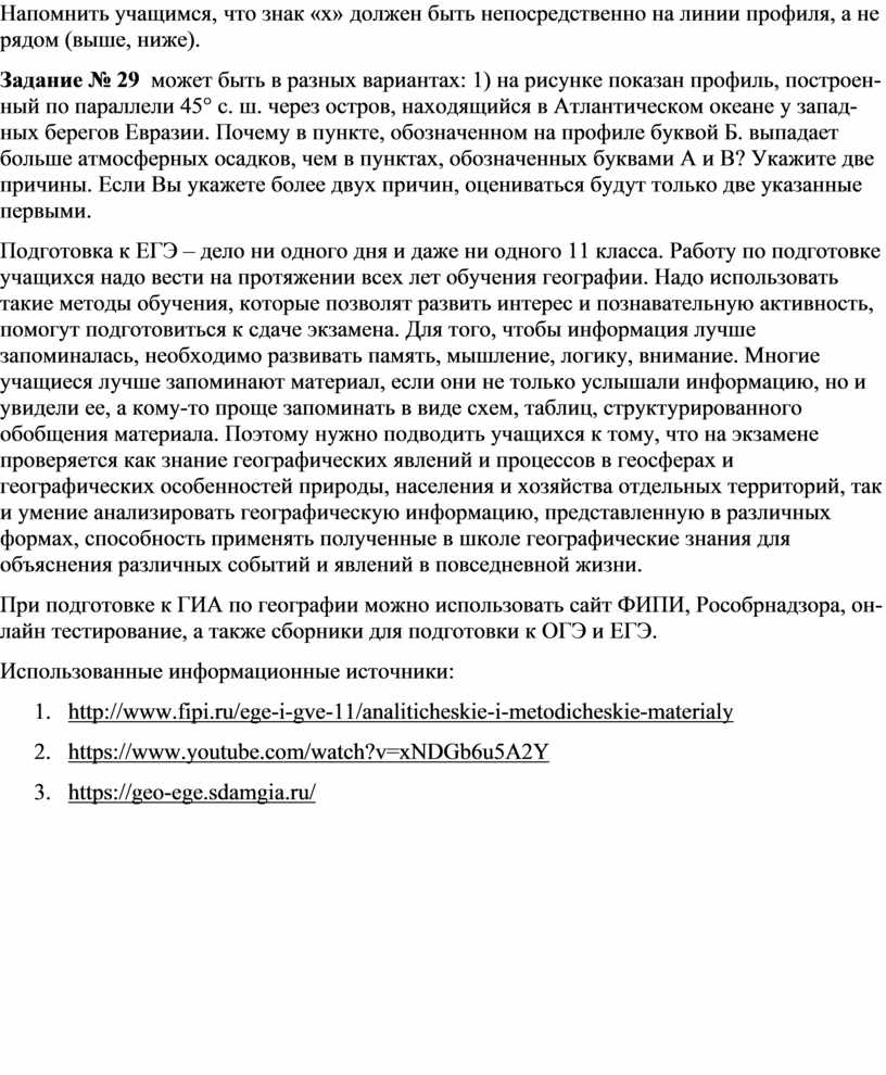 Подготовка к ЕГЭ – дело ни одного дня и даже ни одного 11 класса. Работу по подготовке учащихся надо вести на протяжении всех лет обучения географии. Надо использовать такие методы обучения, которые позволят развить интерес и познавательную активность, помогут подготовиться к сдаче экзамена. Для того, чтобы информация лучше запоминалась, необходимо развивать память, мышление, логику, внимание. Многие учащиеся лучше запоминают материал, если они не только услышали информацию, но и увидели ее, а кому-то проще запоминать в виде схем, таблиц, структурированного обобщения материала. Поэтому нужно подводить учащихся к тому, что на экзамене проверяется как знание географических явлений и процессов в геосферах и географических особенностей природы, населения и хозяйства отдельных территорий, так и умение анализировать географическую информацию, представленную в различных формах, способность применять полученные в школе географические знания для объяснения различных событий и явлений в повседневной жизни.
