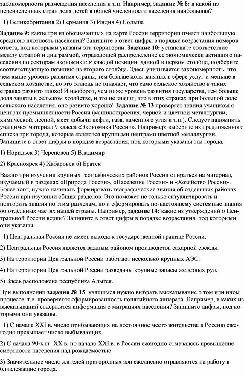 Важно при изучении крупных географических районов России опираться на материал, изучаемый в разделах «Природа России», «Население России» и «Хозяйство России». Более того, нужно начинать формировать географические знания об отдельных районах России при изучении общих разделов. Это поможет не только актуализировать и повторить знания по этим разделам, но и сформировать по-настоящему системные знания об отдельных частях нашей страны. Например, задание 14: какие из утверждений о Центральной России верны? Запишите в ответ цифры в порядке возрастания, под которыми они указаны.