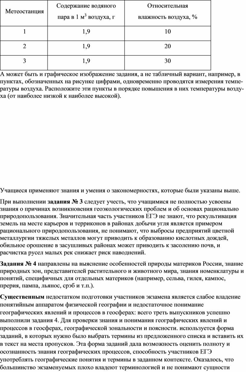 Существенным недостатком подготовки участников экзамена является слабое владение понятийным аппаратом физической географии и недостаточное понимание географических явлений и процессов в геосферах: всего треть выпускников успешно выполнили задания 4. Для проверки знания и понимания географических явлений и процессов в геосферах, географической зональности и поясности. используется форма заданий, в которых нужно было выбрать термины из предложенного списка и вставить их в текст на места пропусков. Эта форма заданий дала возможность оценить полноту и осознанность знания географических процессов, способность участников ЕГЭ употреблять географические понятия и термины в заданном контексте. Оказалось, что большинство экзаменуемых плохо владеют терминологией и не понимают сущности географических процессов. Типичные ошибки при выполнении этих заданий связаны с несколькими аспектами. Часть экзаменуемых путают понятия: «половодье» и «паводок», «нижнее течение реки» и «верхнее течение реки», «погода» и «климат» и т.п. Другая часть выполнявших работу не понимает сущности географических процессов и явлений: поглощение солнечной радиации темной поверхностью, восходящее движение воздуха в циклонах и нисходящее в антициклонах и т.п. Также выделяется часть экзаменуемых, ошибки которых связаны с незнанием и непониманием проявления закономерностей на конкретных территориях.