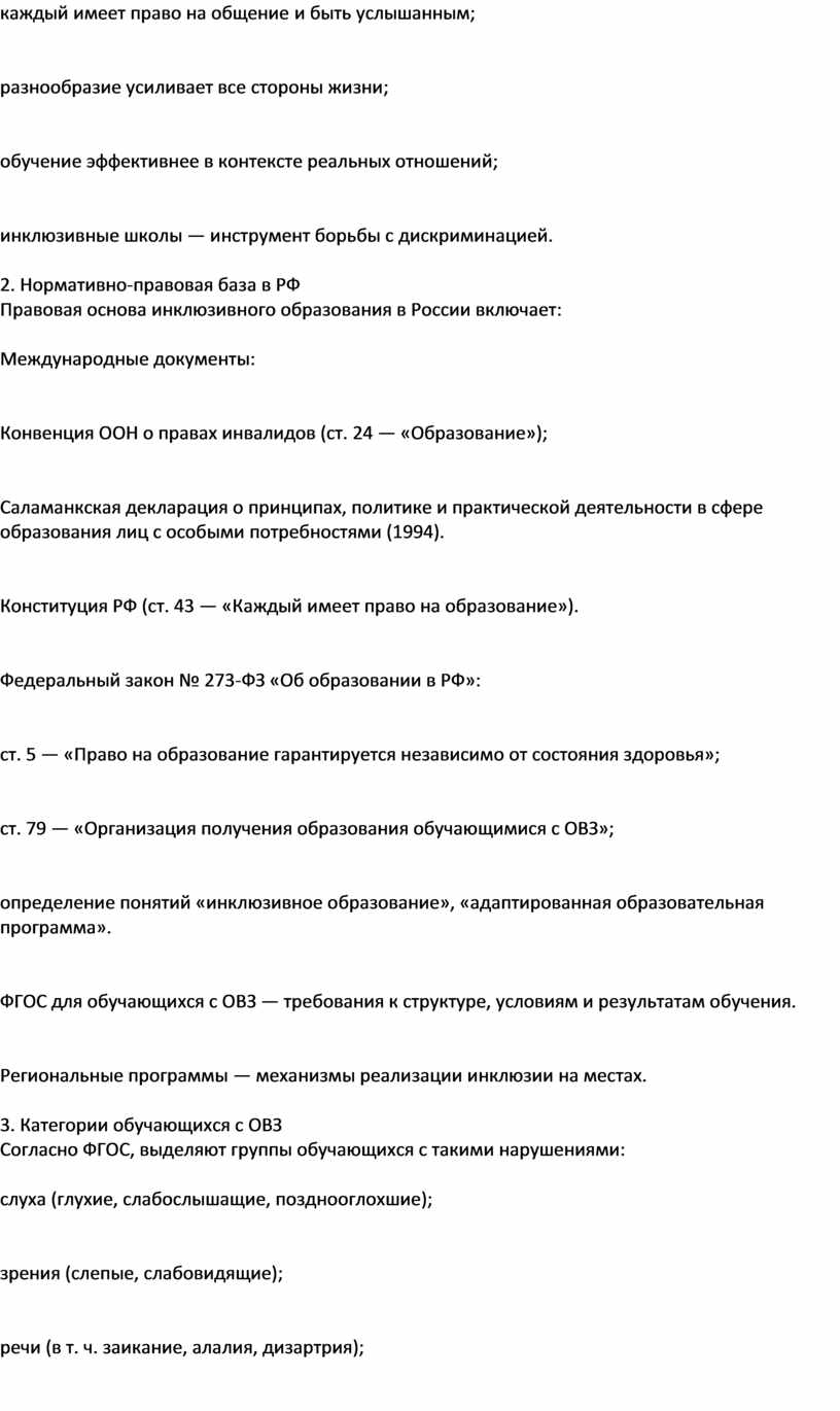 Правовая основа инклюзивного образования в России включает: