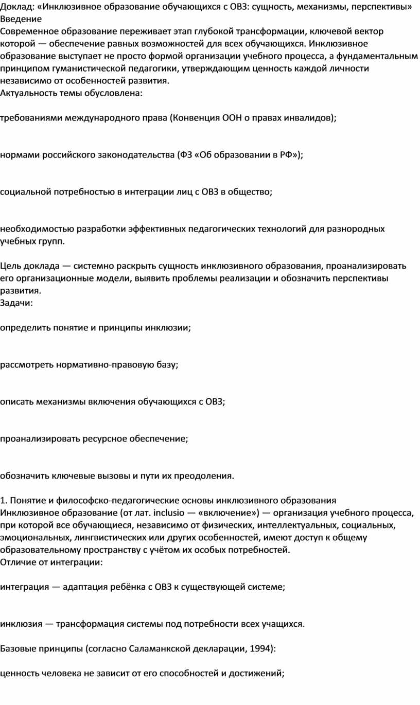 Доклад: «Инклюзивное образование обучающихся с ОВЗ: сущность, механизмы, перспективы»