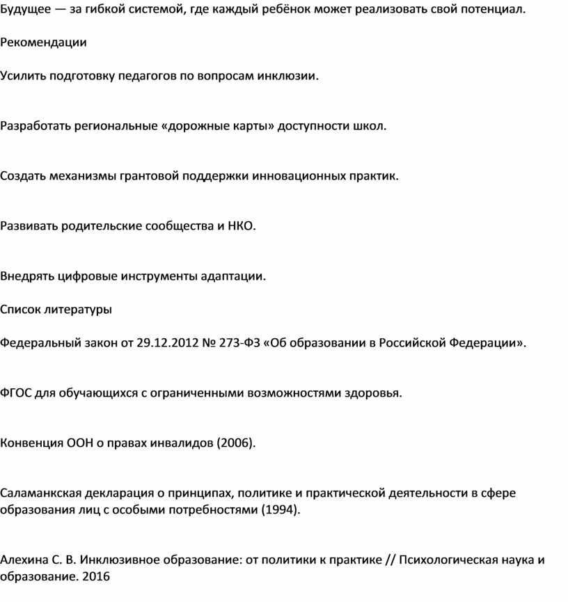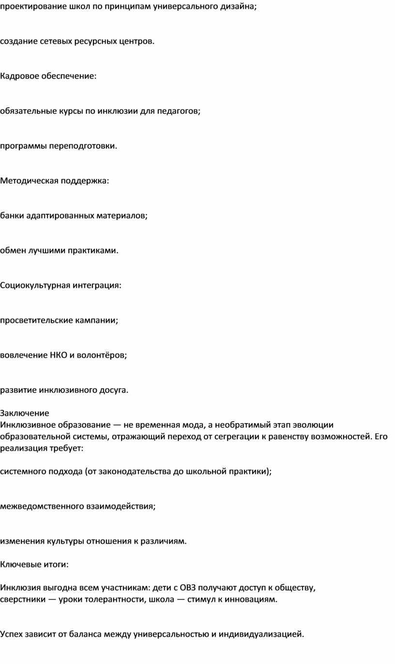 Инклюзивное образование — не временная мода, а необратимый этап эволюции образовательной системы, отражающий переход от сегрегации к равенству возможностей. Его реализация требует: