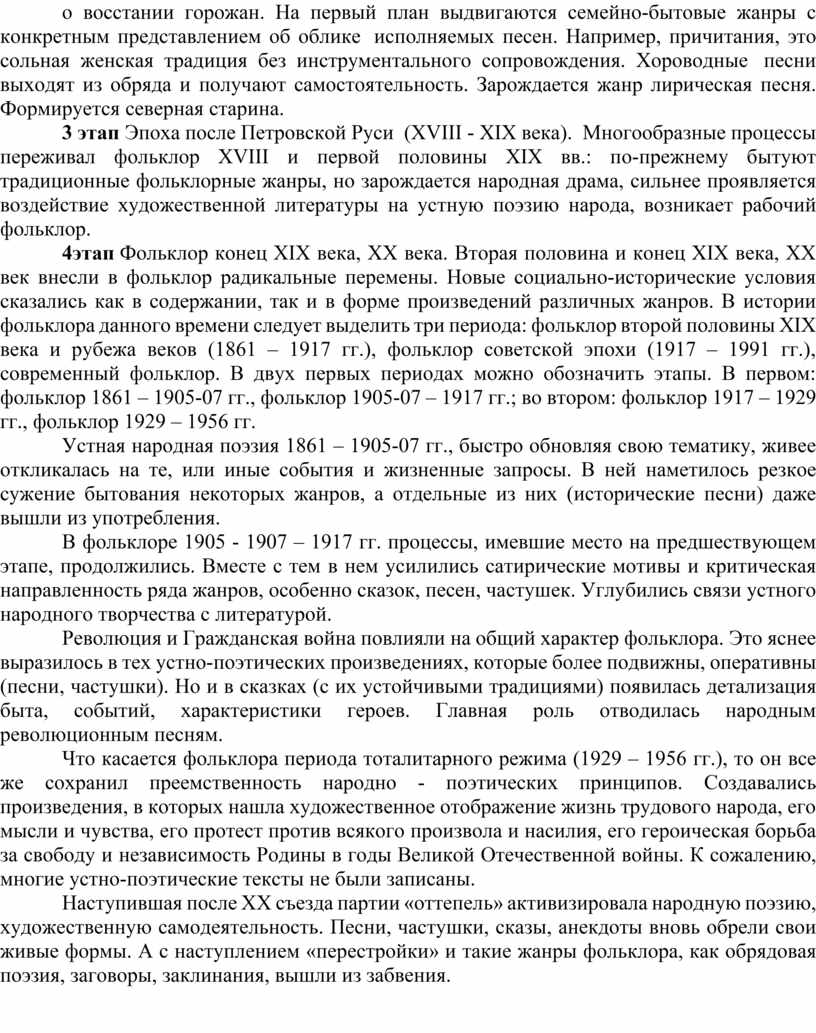 3 этап Эпоха после Петровской Руси (XVIII - XIX века). Многообразные процессы переживал фольклор XVIII и первой половины XIX вв.: по-прежнему бытуют традиционные фольклорные жанры, но зарождается народная драма, сильнее проявляется воздействие художественной литературы на устную поэзию народа, возникает рабочий фольклор.