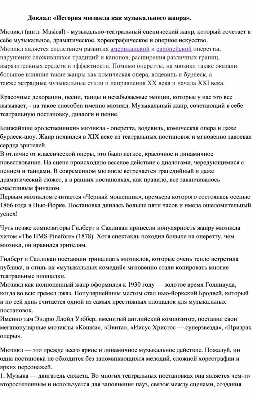 Доклад: «История мюзикла как музыкального жанра».