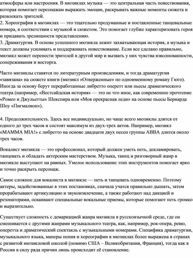 создания атмосферы или настроения. В мюзиклах музыка — это центральная часть