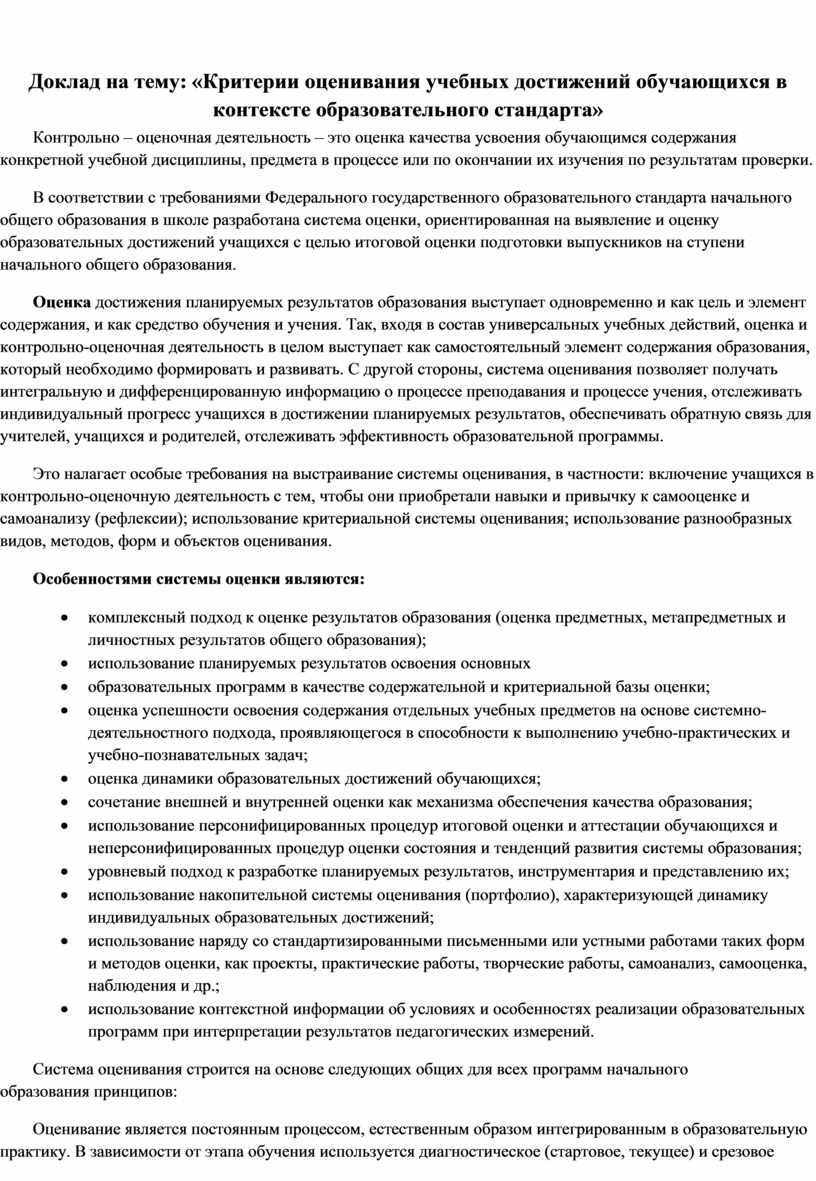 Доклад на тему: «Критерии оценивания учебных достижений обучающихся в контексте образовательного стандарта»