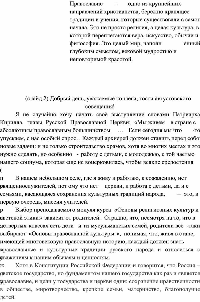 Я не случайно хочу начать своё выступление словами Патриарха Кирилла, главы Русской Православной Церкви: «Мы живем в стране с абсолютным православным большинством… Если сегодня мы что-то упускаем, с нас особый спрос… Каждый архиерей должен ставить перед собой новые задачи: и не только строительство храмов, хотя во многих местах и это нужно сделать, но особенно - работу с детьми, с молодежью, с той частью нашего социума, которая еще не воцерковилась, чтобы всякие средостения (преграды) между церковью и обществом окончательно исчезли».
