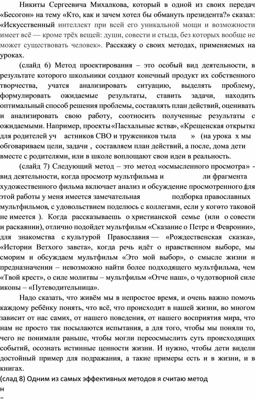 (слайд 5) Если говорить о методах, то их тоже сегодня достаточно. Кто-то даже использует и технологии с применением искусственного интеллекта, создавая невероятно красивые картинки, оживляя давно ушедших в мир иной знаменитых людей или даже пытаются представить Бога (Например, на фото Швейцарии голографический ИИ-Иисус принимает исповеди), однако сразу оговорюсь, что предпочитаю другие методы. Почему? Отвечу словами Никиты Сергеевича Михалкова, который в одной из своих передач «Бесогон» на тему «Кто, как и зачем хотел бы обмануть президента?» сказал: «Искусственный интеллект при всей его уникальной мощи и возможности имеет всё — кроме трёх вещей: души, совести и стыда, без которых вообще не может существовать человек». Расскажу о своих методах, применяемых на уроках.