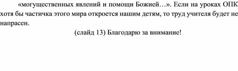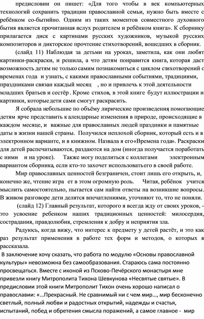 В заключение хочу сказать, что работа по модулю «Основы православной культуры» невозможна без самообразования. Стараюсь сама постоянно просвещаться. Вместе с иконой из Псково-Печёрского монастыря мне привезли книгу Митрополита Тихона Шевкунова «Несвятые святые». В предисловии этой книги Митрополит Тихон очень хорошо написал о православии: «…Прекрасный. Не сравнимый ни с чем мир…, мир бесконечно светлый, полный любви и радостных открытий, надежды и счастья, испытаний, побед и обретения смысла поражений, а самое главное - мир «могущественных явлений и помощи Божией…». Если на уроках ОПК хотя бы частичка этого мира откроется нашим детям, то труд учителя будет не напрасен.