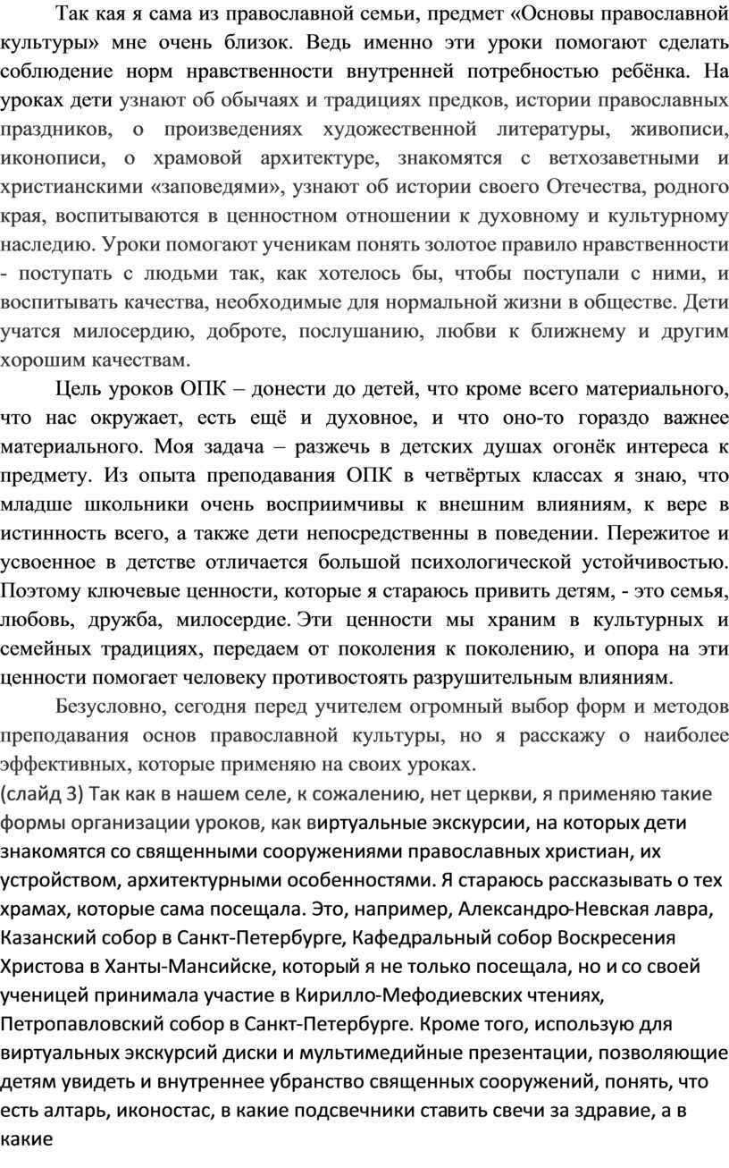 Так кая я сама из православной семьи, предмет «Основы православной культуры» мне очень близок. Ведь именно эти уроки помогают сделать соблюдение норм нравственности внутренней потребностью ребёнка. На уроках дети узнают об обычаях и традициях предков, истории православных праздников, о произведениях художественной литературы, живописи, иконописи, о храмовой архитектуре, знакомятся с ветхозаветными и христианскими «заповедями», узнают об истории своего Отечества, родного края, воспитываются в ценностном отношении к духовному и культурному наследию. Уроки помогают ученикам понять золотое правило нравственности - поступать с людьми так, как хотелось бы, чтобы поступали с ними, и воспитывать качества, необходимые для нормальной жизни в обществе. Дети учатся милосердию, доброте, послушанию, любви к ближнему и другим хорошим качествам.