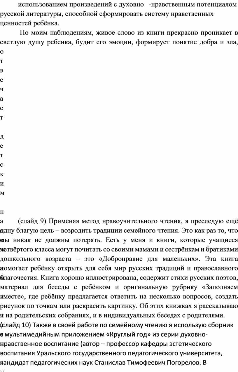 (слайд 9) Применяя метод нравоучительного чтения, я преследую ещё одну благую цель – возродить традиции семейного чтения. Это как раз то, что мы никак не должны потерять. Есть у меня и книги, которые учащиеся четвёртого класса могут почитать со своими мамами и сестрёнкам и братиками дошкольного возраста – это «Добронравие для маленьких». Эта книга помогает ребёнку открыть для себя мир русских традиций и православного благочестия. Книга хорошо иллюстрирована, содержит стихи русских поэтов, материал для беседы с ребёнком и оригинальную рубрику «Заполняем вместе», где ребёнку предлагается ответить на несколько вопросов, создать рисунок по точкам или раскрасить картинку. Об этих книжках я рассказываю и на родительских собраниях, и в индивидуальных беседах с родителями.