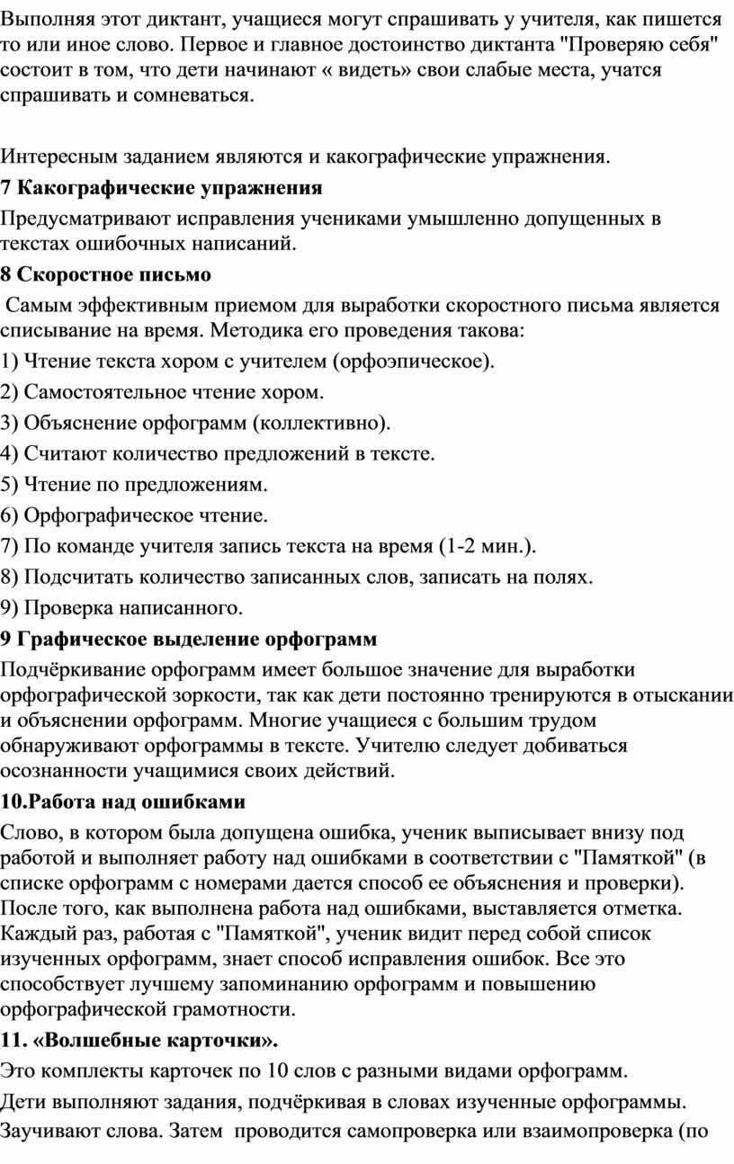 Предлагаемый прием списывания разработан группой психологов под руководством В.В. Репкина и П.С. Жедек. Для того, чтобы данная работа дала желаемый результат, она должна проводиться ежедневно, желательно на протяжении всей начальной школы, должен жестко соблюдаться сам алгоритм письма, так как каждый шаг имеет определенную смысловую нагрузку и не может быть выкинут из списка. Только полное воспроизведение алгоритма гарантирует успех.