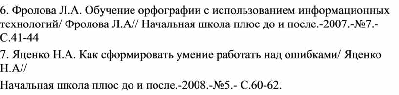 6. Фролова Л.А. Обучение орфографии с использованием информационных технологий/ Фролова Л.А// Начальная школа плюс до и после.-2007.-№7.- С.41-44