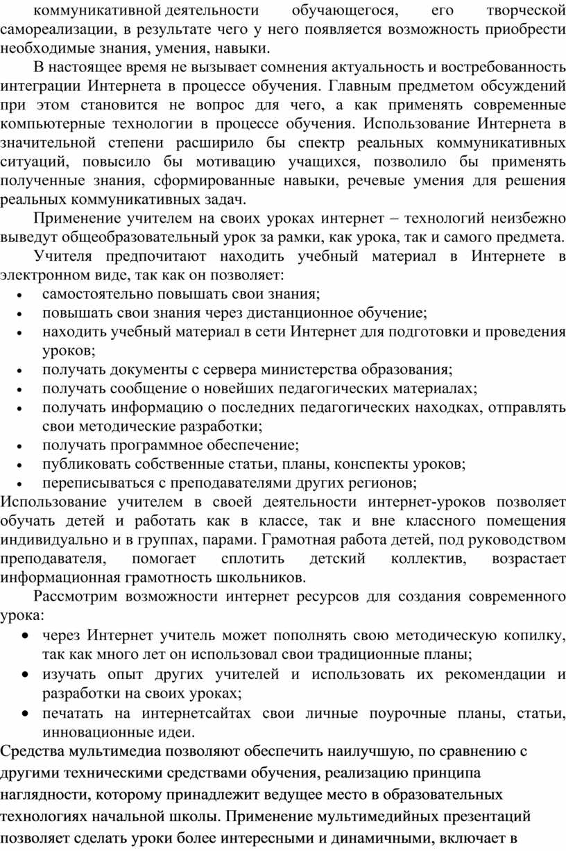Интернет предоставляет уникальные возможности для полноценного образования и формирования личности. Он представляет собой не только практически неисчерпаемый массив образовательной информации, но и выступает как средство, инструмент для ее поиска, переработки, представления. Интернет является уникальным источником активной интеллектуальной и коммуникативной деятельности обучающегося, его творческой самореализации, в результате чего у него появляется возможность приобрести необходимые знания, умения, навыки.