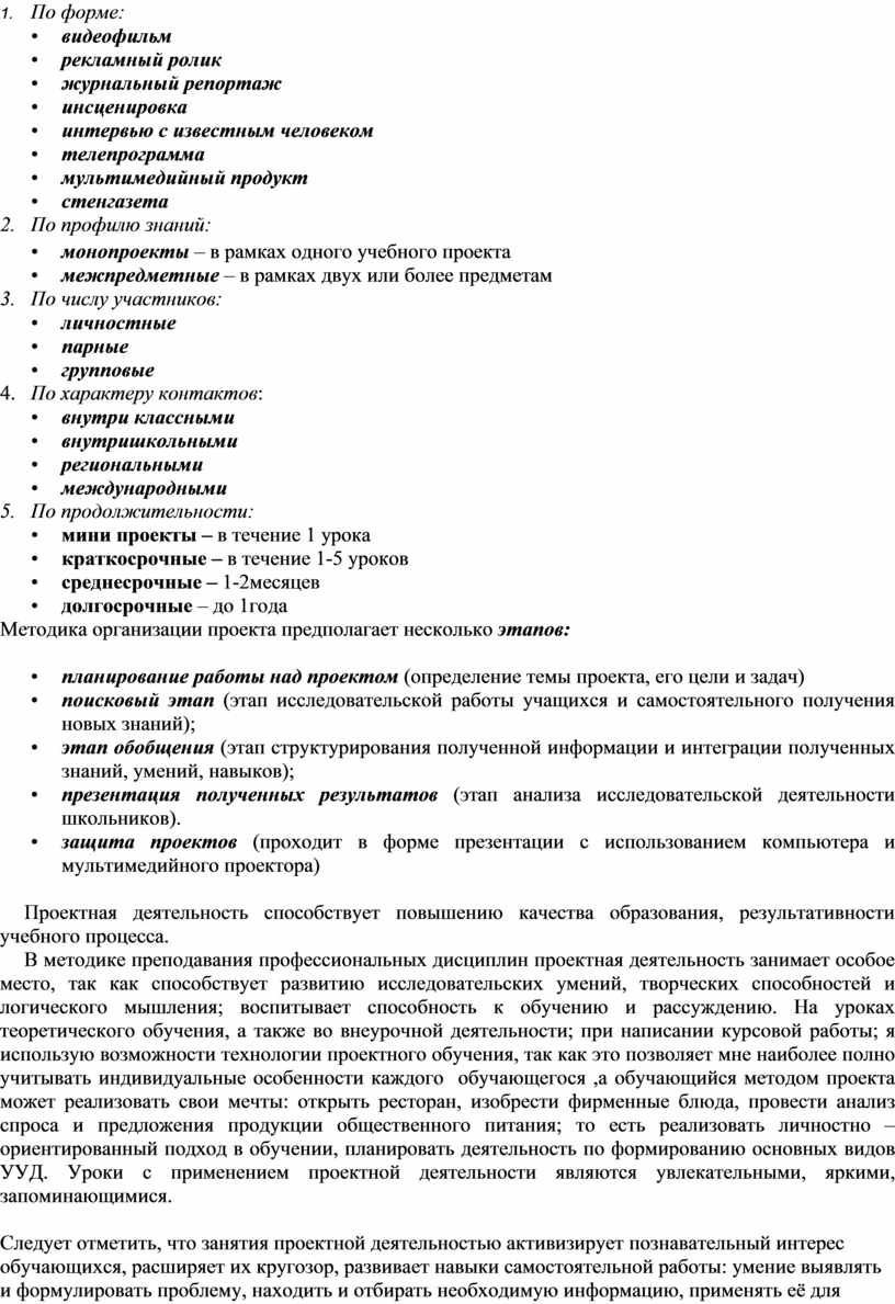 В методике преподавания профессиональных дисциплин проектная деятельность занимает особое место, так как способствует развитию исследовательских умений, творческих способностей и логического мышления; воспитывает способность к обучению и рассуждению. На уроках теоретического обучения, а также во внеурочной деятельности; при написании курсовой работы; я использую возможности технологии проектного обучения, так как это позволяет мне наиболее полно учитывать индивидуальные особенности каждого обучающегося ,а обучающийся методом проекта может реализовать свои мечты: открыть ресторан, изобрести фирменные блюда, провести анализ спроса и предложения продукции общественного питания; то есть реализовать личностно – ориентированный подход в обучении, планировать деятельность по формированию основных видов УУД. Уроки с применением проектной деятельности являются увлекательными, яркими, запоминающимися.