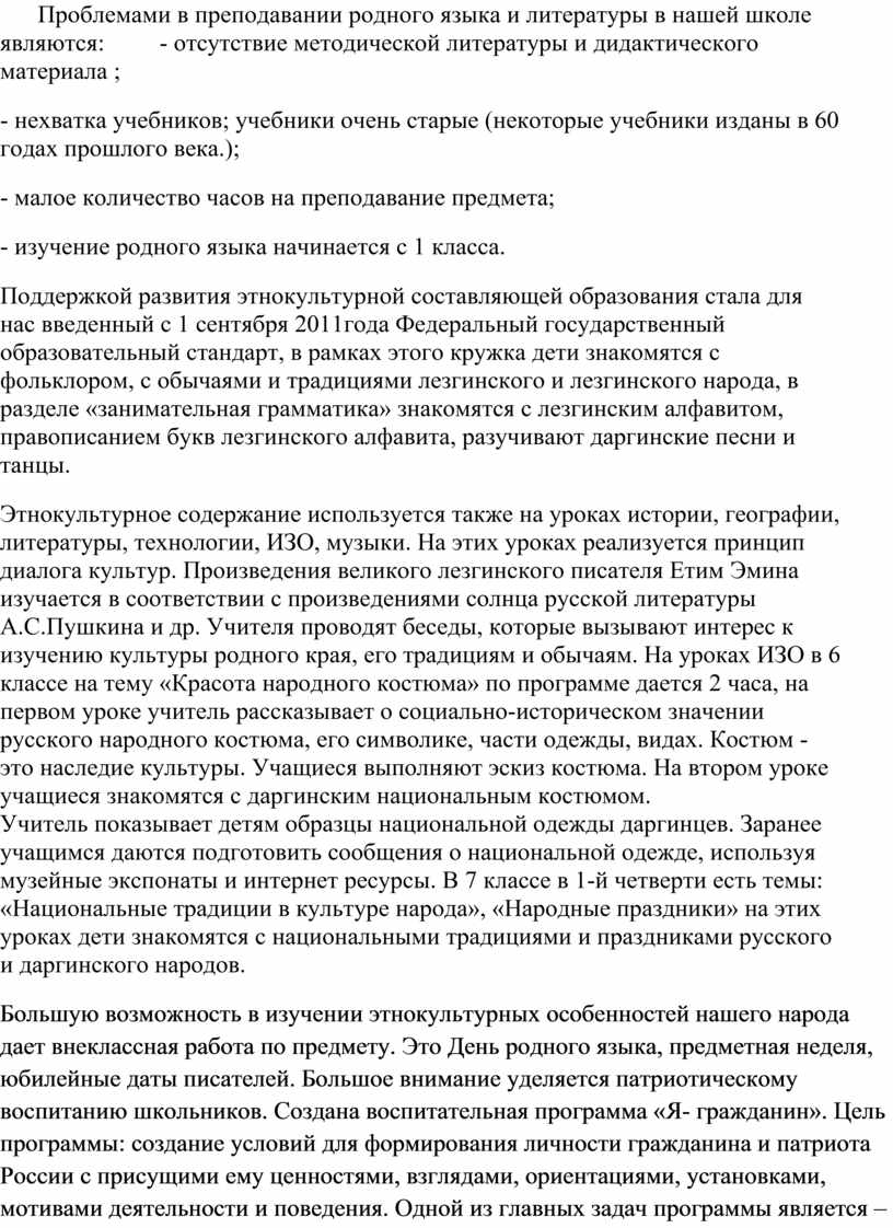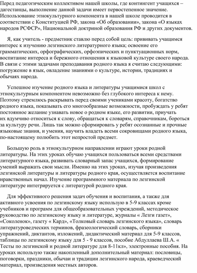 Перед педагогическим коллективом нашей школы, где контингент учащихся – дагестанцы, выполнение данной задачи имеет первостепенное значение. Использование этнокультурного компонента в нашей школе проводится в соответствии с Конституцией РФ, закона «Об образовании», закона «О языках народов РСФСР», Национальной доктриной образования РФ и других документов.