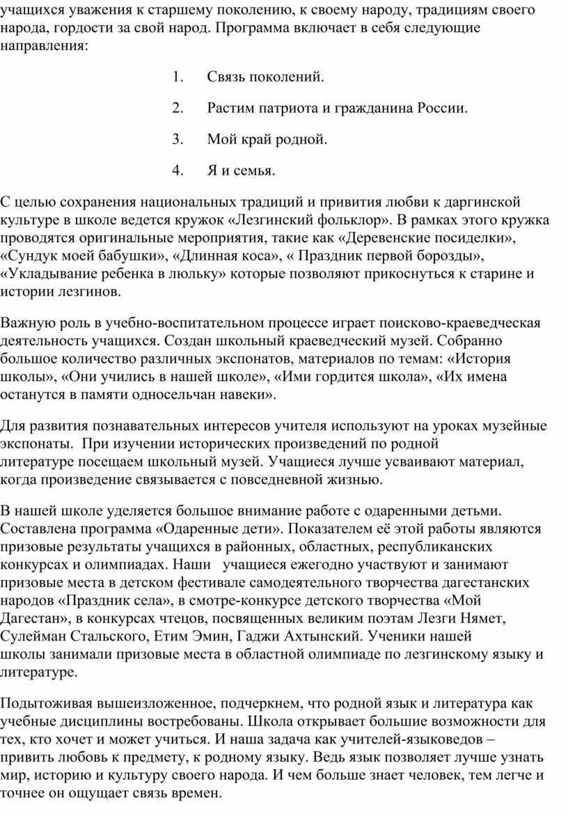 Большую роль в этнокультурном направлении играют уроки родной литературы. На этих уроках обучаю учащихся пользоваться всеми средствами литературного языка, развивать словарный запас учащихся, формирование умений выражать свои мысли. Именно на этих уроках, изучая произведения лезгинской литературы и литературы родного края, осуществляется воспитание нравственных начал. Изучение программного материала по лезгинской литературе интегрируется с литературой родного края.