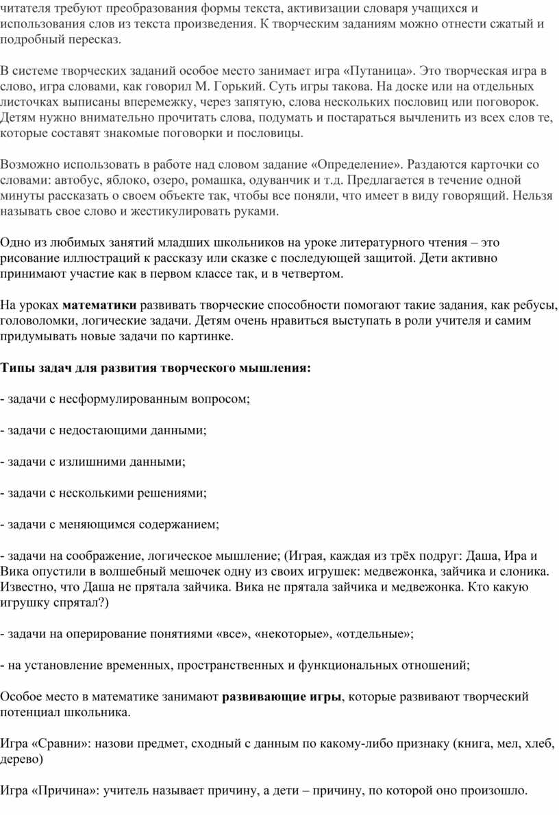 Начиная со второго класса можно детям предложить творческий пересказ – это трансформация текста с целью его переосмысления. Существует два вида творческого пересказа: пересказ по измененному плану и изменение лица рассказчика. Рассказ по воображению и рассказ от имени читателя требуют преобразования формы текста, активизации словаря учащихся и использования слов из текста произведения. К творческим заданиям можно отнести сжатый и подробный пересказ.