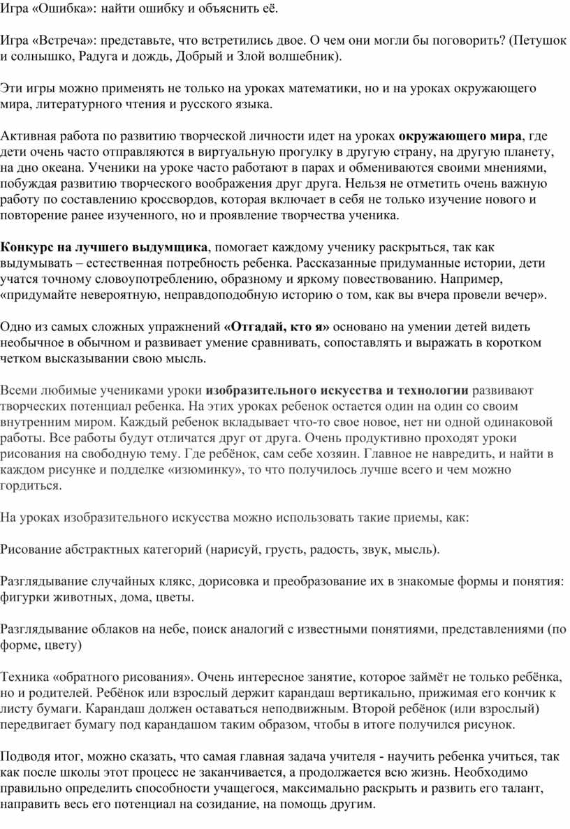 Трудно не согласиться с этим выражением. Начальная школа закладывает в детях начало всего: все что представляет человек из себя во взрослой жизни, было заложено в начальной школе. Поэтому современное общество большое внимание уделяет развитию всех способностей ребенка, старается создать всесторонне развитую личность. Именно начальная школа имеет уникальную возможность раскрыть, увидеть, распознать первый, еще еле заметный росточек творческого начала. Но именно начальная школа не имеет права на ошибку: то есть пройти мимо и не заметить творческой искорки в маленьком человеке, а еще хуже затушить ее своей некомпетентностью или просто нежеланием замечать что-либо.