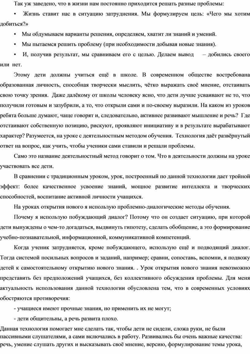 Этому дети должны учиться ещё в школе. В современном обществе востребована образованная личность, способная творчески мыслить, чётко выражать своё мнение, отстаивать свою точку зрения. Даже далёкому от школы человеку ясно, что дети лучше усваивают не то, что получили готовым и зазубрили, а то, что открыли сами и по-своему выразили. На каком из уроков ребята больше думают, чаще говорят и, следовательно, активнее развивают мышление и речь? Где отстаивают собственную позицию, рискуют, проявляют инициативу и в результате вырабатывают характер? Разумеется, на уроке с деятельностным методом обучения. Технология даёт развёрнутый ответ на вопрос, как учить, чтобы ученики сами ставили и решали проблемы.
