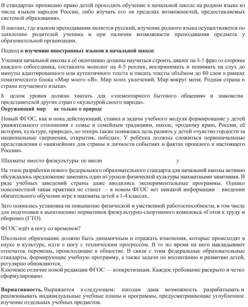 В стандартах прописано право детей проходить обучение в начальной школе на родном языке из числа языков народов России, либо изучать его «в пределах возможностей, предоставляемых системой о0разования».