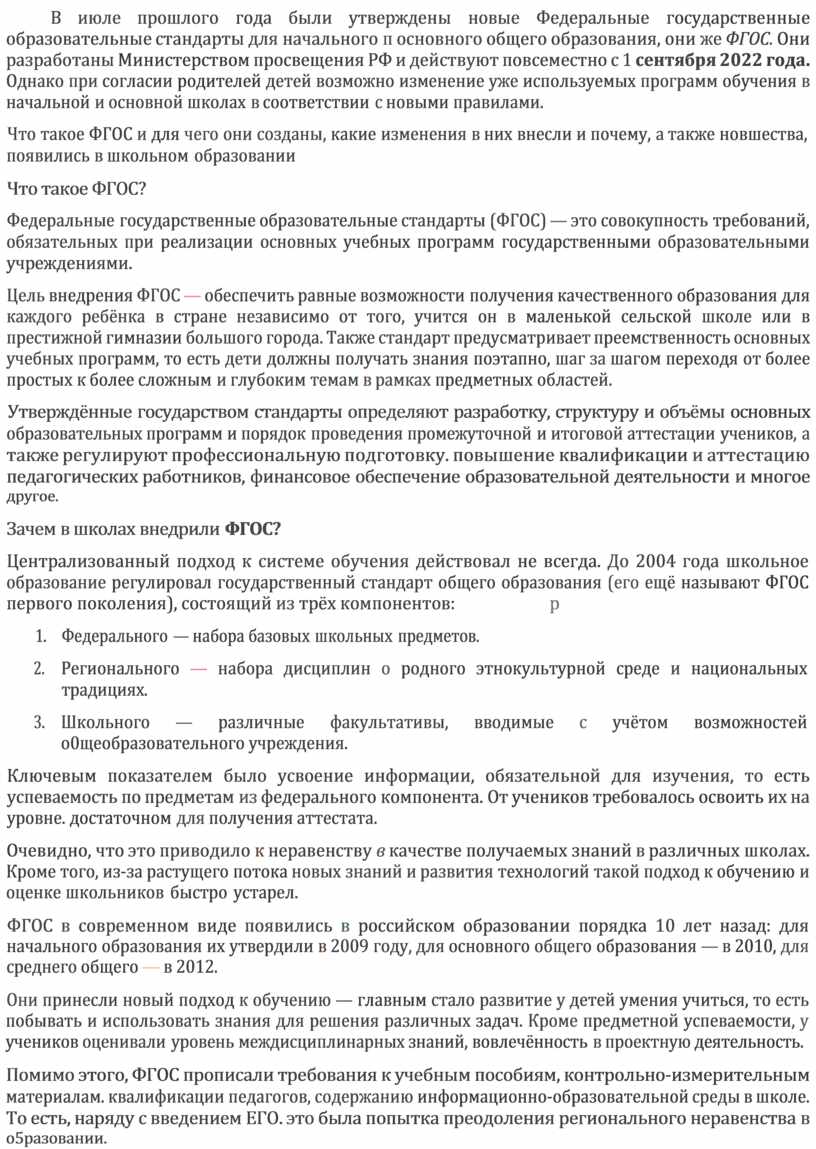 В июле прошлого года были утверждены новые Федеральные государственные образовательные стандарты для начального п основного общего образования, они же ФГОС. Они разработаны Министерством просвещения РФ и действуют повсеместно с 1 сентября 2022 года. Однако при согласии родителей детей возможно изменение уже используемых программ обучения в начальной и основной школах в соответствии с новыми правилами.