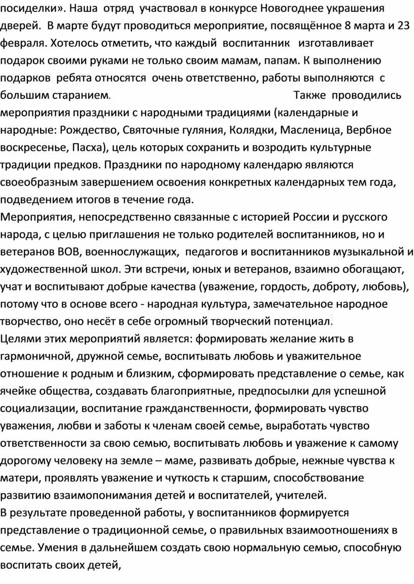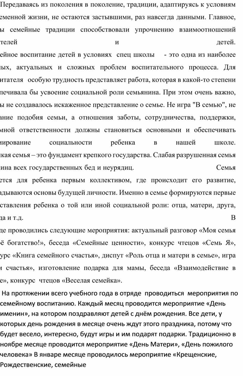На протяжении всего учебного года в отряде проводиться мероприятия по семейному воспитанию. Каждый месяц проводится мероприятие «День именин», на котором поздравляют детей с днём рождения. Все дети, у которых день рождения в месяце очень ждут этого праздника, потому что будет весело, интересно, будут игры и им подарят подарки. Традиционно в ноябре месяце проводится мероприятие «День Матери», «День пожилого человека» В январе месяце проводилось мероприятие «Крещенские, Рождественские, семейные посиделки». Наша отряд участвовал в конкурсе Новогоднее украшения дверей. В марте будут проводиться мероприятие, посвящённое 8 марта и 23 февраля. Хотелось отметить, что каждый воспитанник изготавливает подарок своими руками не только своим мамам, папам. К выполнению подарков ребята относятся очень ответственно, работы выполняются с большим старанием. Также проводились мероприятия праздники с народными традициями (календарные и народные: Рождество, Святочные гуляния, Колядки, Масленица, Вербное воскресенье, Пасха), цель которых сохранить и возродить культурные традиции предков. Праздники по народному календарю являются своеобразным завершением освоения конкретных календарных тем года, подведением итогов в течение года. Мероприятия, непосредственно связанные с историей России и русского народа, с целью приглашения не только родителей воспитанников, но и ветеранов ВОВ, военнослужащих, педагогов и воспитанников музыкальной и художественной школ. Эти встречи, юных и ветеранов, взаимно обогащают, учат и воспитывают добрые качества (уважение, гордость, доброту, любовь), потому что в основе всего - народная культура, замечательное народное творчество, оно несёт в себе огромный творческий потенциал. Целями этих мероприятий является: формировать желание жить в гармоничной, дружной семье, воспитывать любовь и уважительное отношение к родным и близким, сформировать представление о семье, как ячейке общества, создавать благоприятные, предпосылки для успешной социализации, воспитание гражданственности, формировать чувство уважения, любви и заботы к членам своей семье, выработать чувство ответственности за свою семью, воспитывать любовь и уважение к самому дорогому человеку на земле – маме, развивать добрые, нежные чувства к матери, проявлять уважение и чуткость к старшим, способствование развитию взаимопонимания детей и воспитателей, учителей. В результате проведенной работы, у воспитанников формируется представление о традиционной семье, о правильных взаимоотношениях в семье. Умения в дальнейшем создать свою нормальную семью, способную воспитать своих детей, умеющую ориентироваться в различных жизненных ситуациях. Соблюдая и бережно передавая семейные традиции, мы сохраняем связь поколений, по кирпичикам закладываем прочный фундамент гармоничной и счастливой жизни на долгие годы.